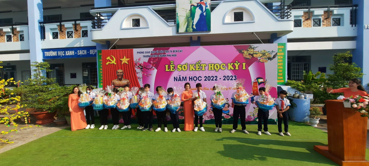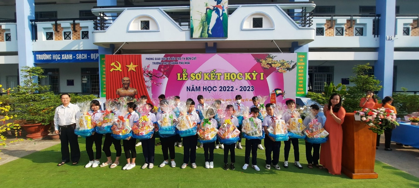 Đại diện Ban giám hiệu nhà trường và thầy cô trao những phần quà Tết đầy ý nghĩa đến tận tay các em học sinh.Tác giả: Trung học cơ sở Chánh Phú Hòa