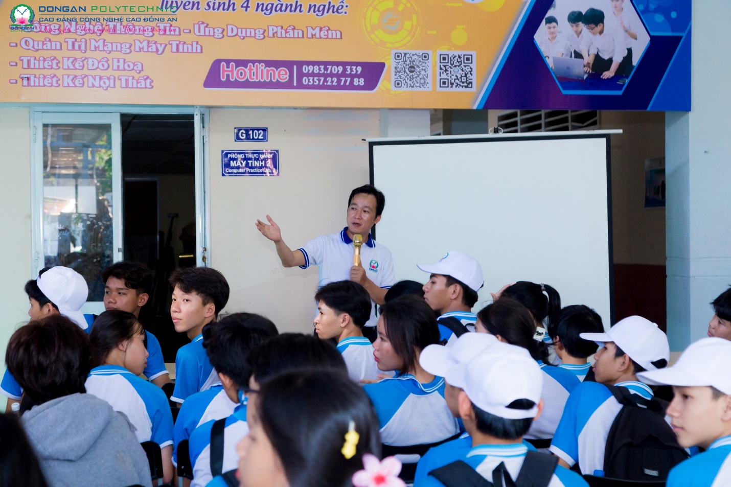 Tại chương trình, các học sinh đã được xem video giới thiệu, giải thích, cung cấp những thông tin bổ ích về tiêu chuẩn tuyển sinh, môi trường đào tạo của Trường Cao đẳng công nghệ cao Đồng An và cơ hội việc làm sau khi tốt nghiệp. Cũng tại đây, thầy Hiệu trưởng - Ths. Nguyễn Thành Trí đã gửi lời chào mừng đoàn và chia sẻ những định hướng nghề nghiệp cũng như những lợi ích khi theo học hệ Cao đẳng 9+ tại trường Cao đẳng công nghệ cao Đồng An. Đặc biệt là những chính sách hỗ trợ học phí, chương trình đào tạo cao đẳng dành cho học sinh học hết lớp 9 trong năm 2024 này, học sinh được xét chọn lựa chương trình học văn hoá lấy bằng tốt nghiệp PTTH trong quá trình học tại trường đã được nhiều em tìm hiểu và quan tâm. Buổi tư vấn, định hướng nghề nghiệp kết hợp tham quan cơ sở vật chất của trường cũng nhằm giúp các em học sinh khám phá và hiểu rõ hơn về những ngành nghề được đào tạo tại trường Cao đẳng Công nghệ cao Đồng An, cũng như nắm bắt được nhu cầu thực tiễn của doanh nghiệp đáp ứng nhu cầu của xã hội trong thời đại công nghệ cao.