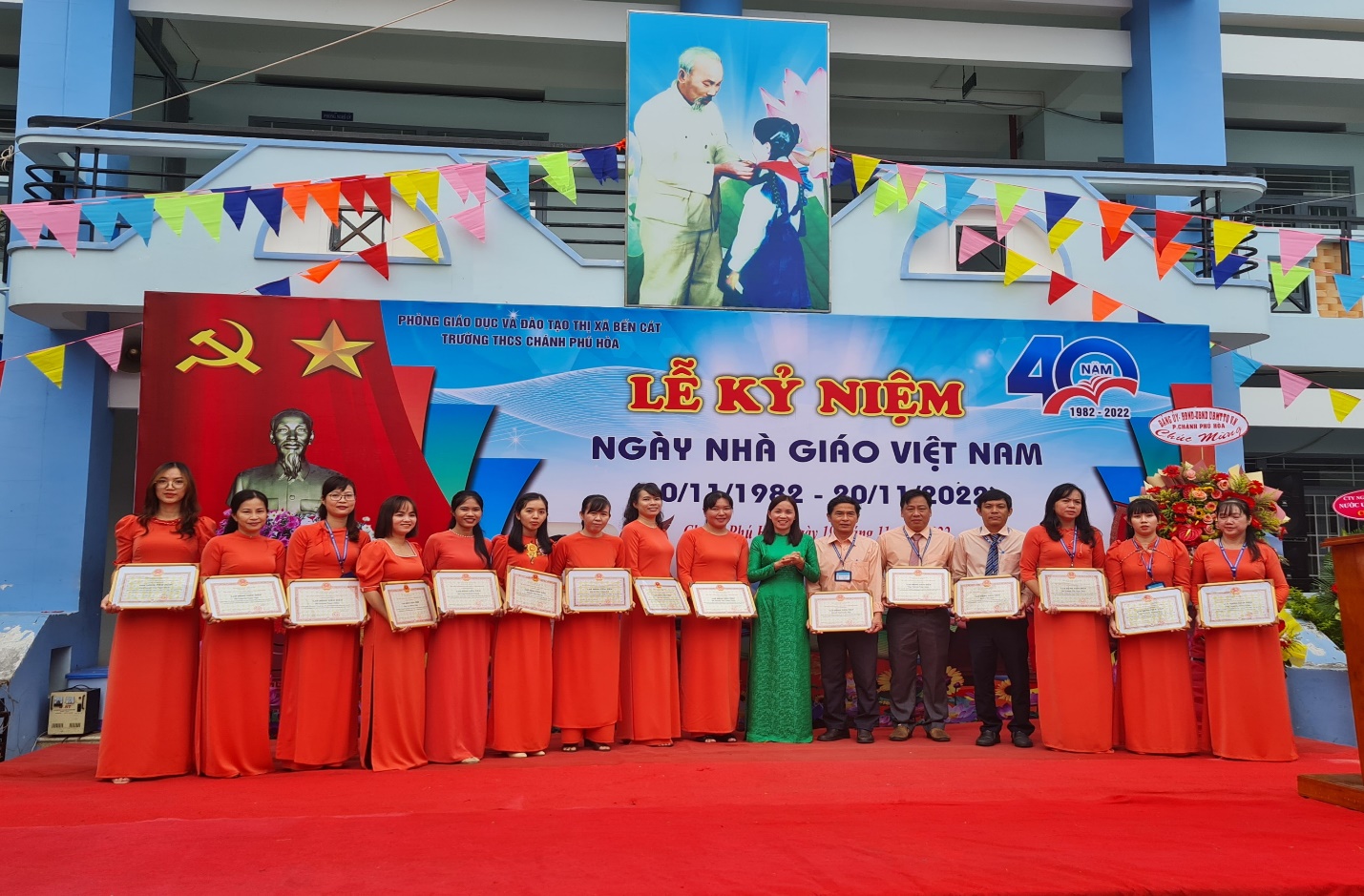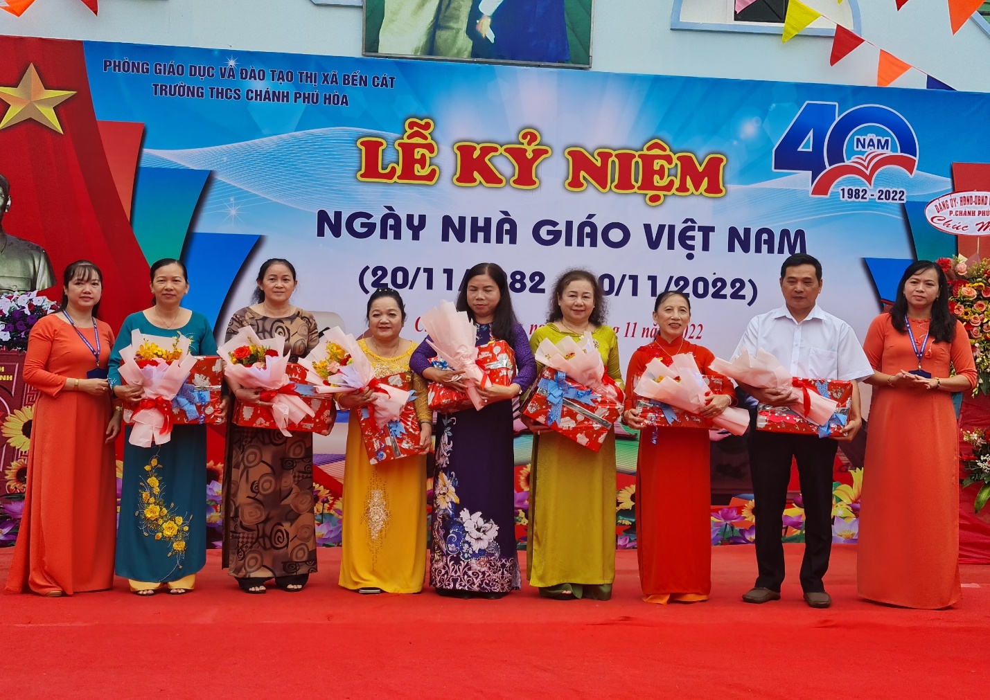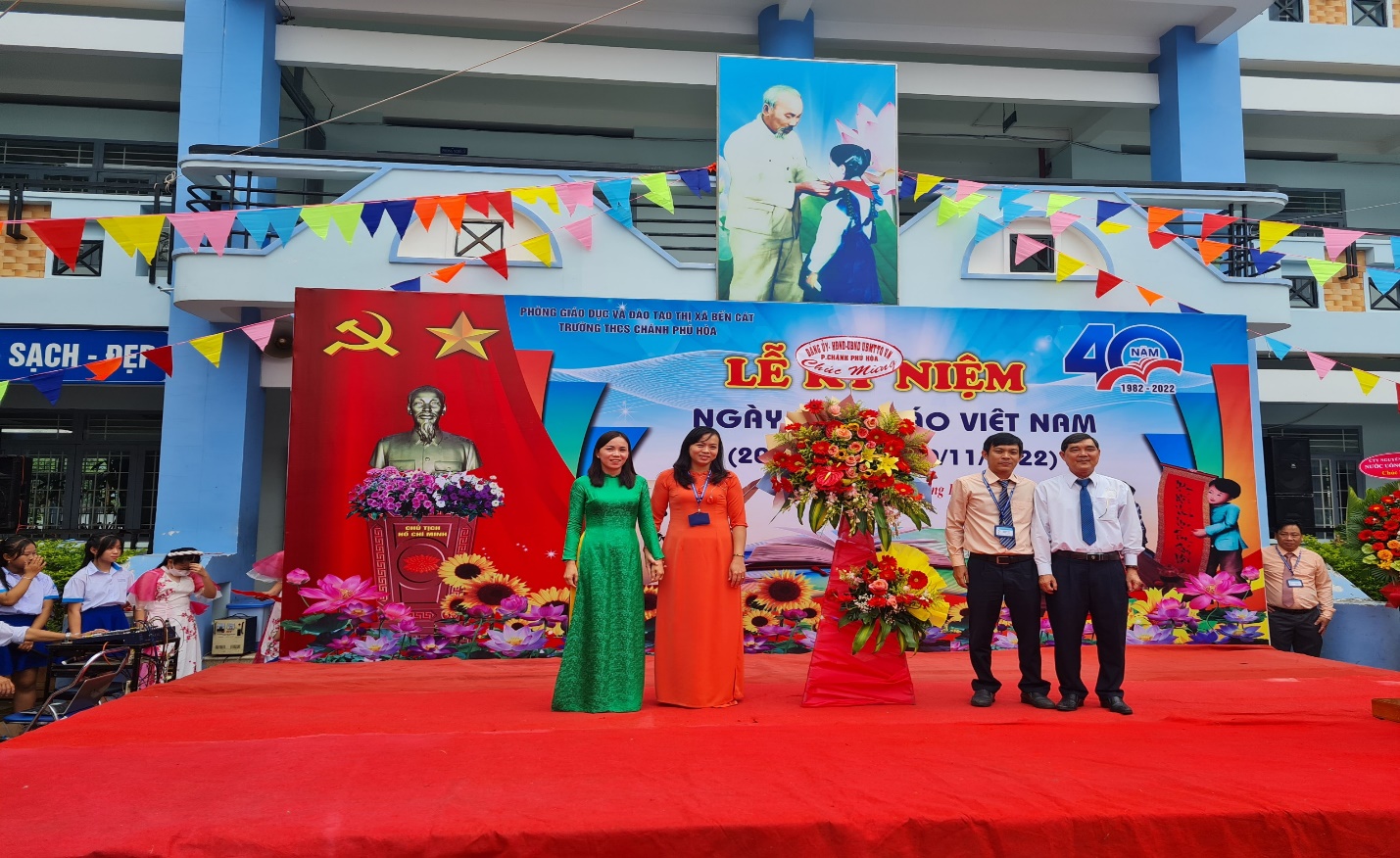 Hòa chung trong không khí tưng bừng, phấn khởi của các thế hệ giáo viên và học sinh trên cả nước chào mừng kỷ niệm 40 năm ngày Nhà giáo Việt Nam (20/11/1982 - 20/11/2022), ngày 19 tháng 11 năm 2022, trường THCS Chánh Phú Hòa đã long trọng tổ chức họp mặt 40 năm ngày Nhà giáo Việt Nam. Về dự buổi họp mặt kỷ niệm ngày nhà giáo việt Nam 20/11 có bà Lê Thị Hồng Châu, chuyên viên phòng Phòng Giáo dục & Đào tạo thị xã Bến Cát; bà Nguyễn Thị Hồng Hoa – Đại diện phường Chánh Phú Hòa; ông Phạm Đình Phú – Trưởng ban đại diện cha mẹ học sinh, ông Phan Trọng Chương – Phó ban đại diện cha mẹ học sinh và các ông bà trong ban đại diện cha mẹ học sinh nhà trường. Về phía nhà trường có cô Huỳnh Thị Ngọc Bích – Bí thư chi bộ, Hiệu trưởng nhà trường; cô Trương Thị Mộng Tuyền – Phó Hiệu trưởng nhà trường, CTCĐ nhà trường; ông Đỗ Quốc Tiến – Phó Hiệu trưởng trường THCS Chánh Phú Hòa. Buổi họp mặt hân hạnh được đón tiếp quý thầy cô Nguyên là Hiệu trưởng và giáo viên về hưu của nhà trường và hiện diện của toàn thể cán bộ, giáo viên, công nhân viên nhà trường cùng sự có mặt của 1347 em học sinh của trường THCS Chánh Phú Hòa để cùng bày tỏ lòng tri ân đến quý thầy cô giáo.