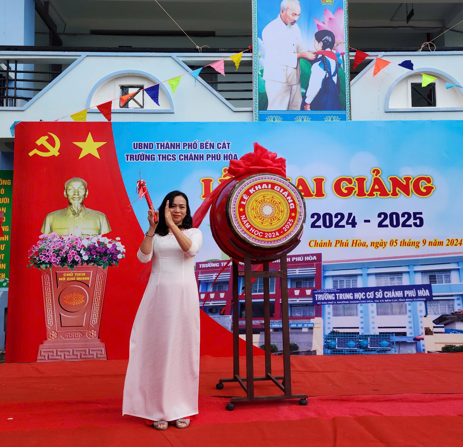 Cô Huỳnh Thị Ngọc Bích – Bí thư chi bộ - Hiệu trưởng nhà trường đánh trống