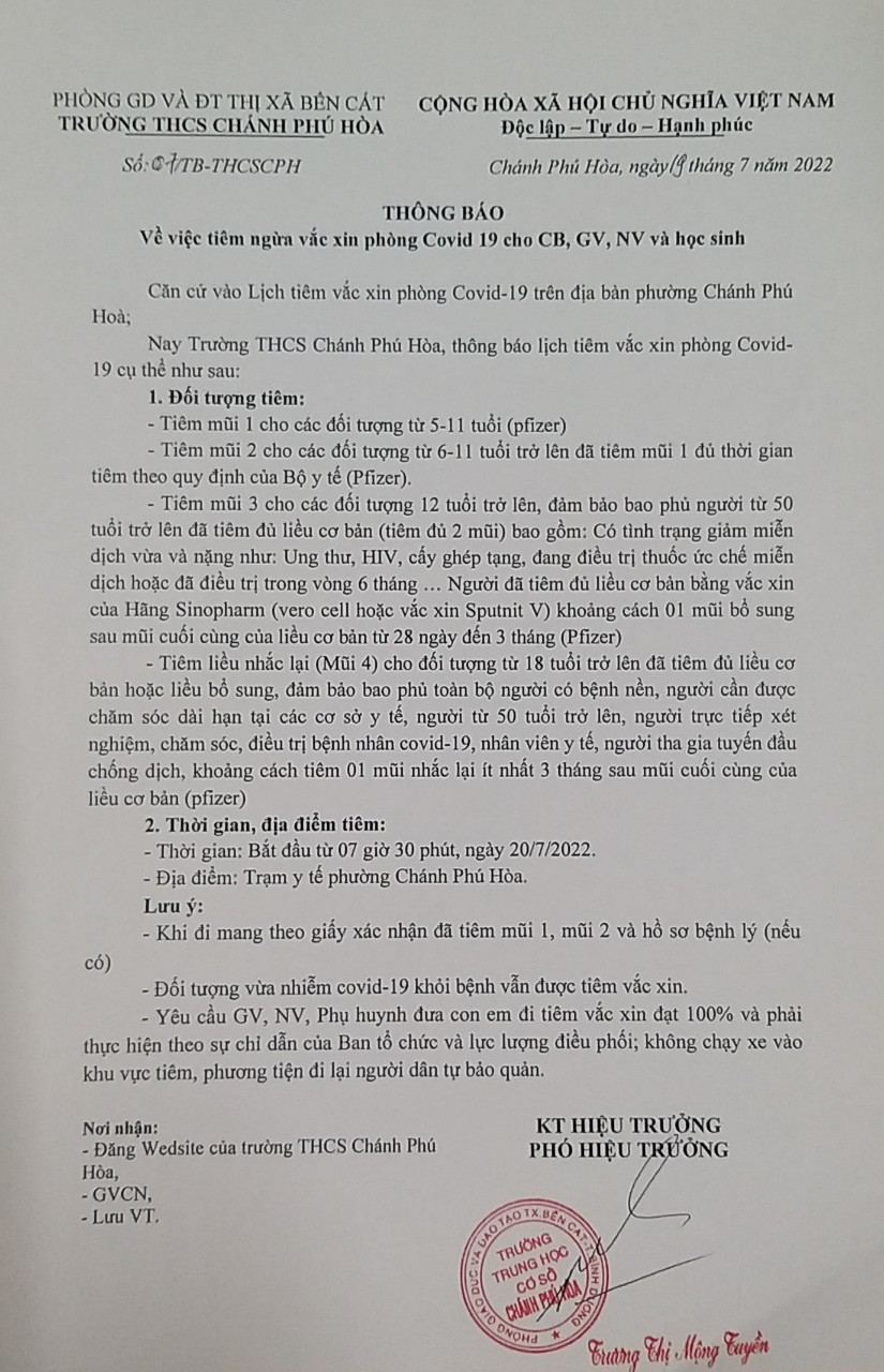 THÔNG BÁO VỀ VIỆC TIÊM NGỪA VẮC XIN PHÒNG CHỐNG COVID 19 CHO CB, GV, NV VÀ HỌC SINH