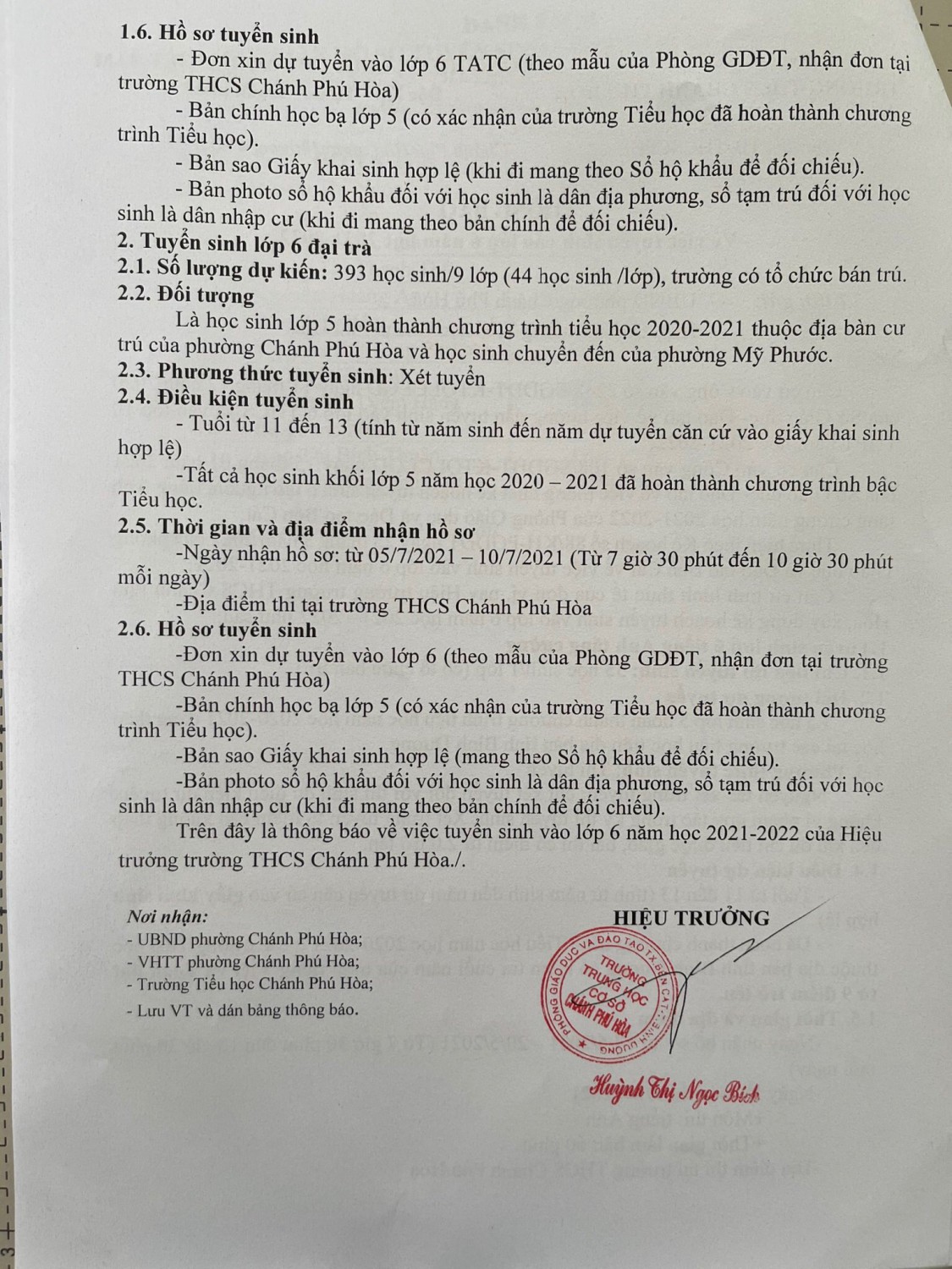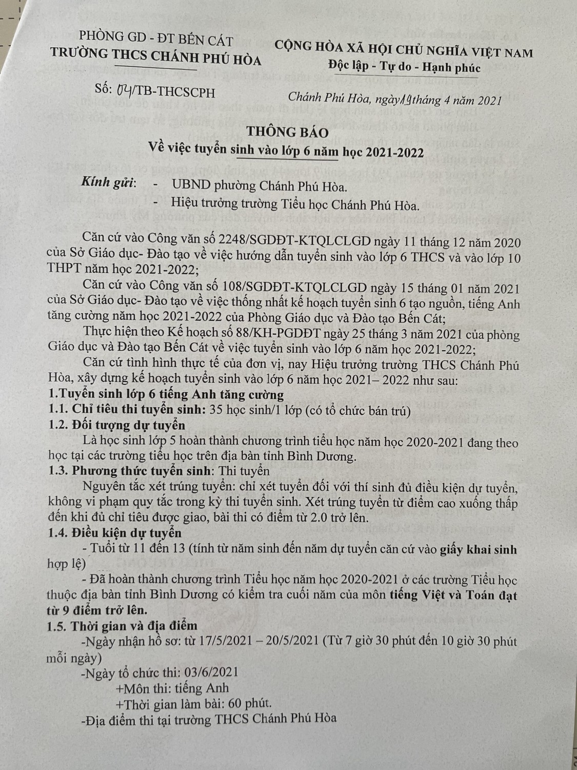THÔNG BÁO VỀ VIỆC TUYỂN SINH VÀO LỚP 6 NĂM HỌC 2021-2022